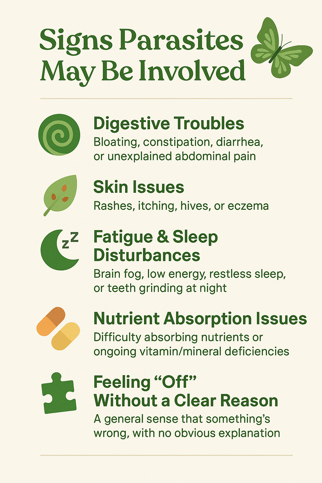 Parasites are organisms that rely on a host to survive, and while exposure is common, it often goes unnoticed. In a healthy body, the immune system usually keeps them in check, but when the immune system is struggling, they can cause issues with digestion, energy, skin, pain, and so much more. The tricky part is parasites are masters of disguise—standard lab tests often miss them, and their symptoms can easily masquerade as other health concerns—showing up like food sensitivities, hormonal changes, or even everyday stress.